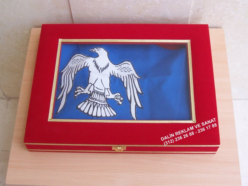 Konu ile ilgili yönergelere uygun olarak dış kısmı süet kadife kaplı olup üst kısmı mika – cam malzemedendir.
